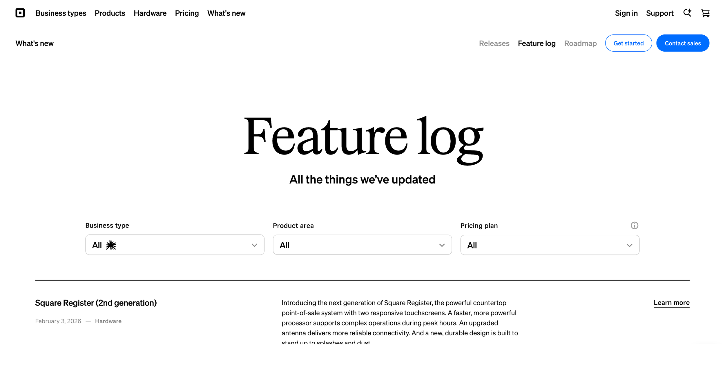 + Feature Log (for newly launched features) and Roadmap (for upcoming features) are pages specifically developed with engineering. These pages pull data from an internal platform so marketing teams can easily update content without production teams assistance.